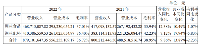 2022年,仲景食品分產(chǎn)品的營(yíng)業(yè)收入、成本、毛利情況