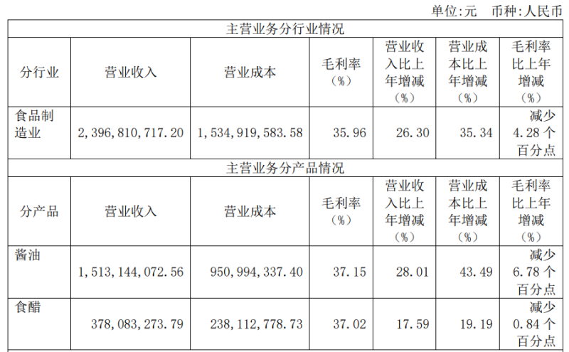 千禾味業(yè)方面表示,2022年,受采購成本上升影響,醬油、食醋的毛利率同比均下降。