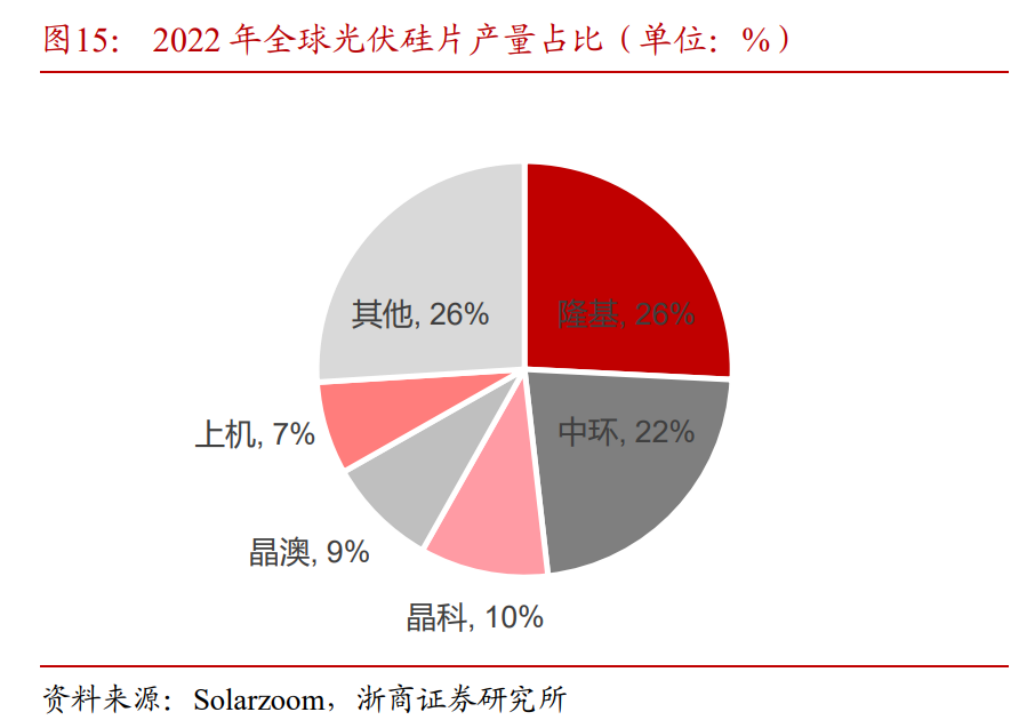 根據(jù)Solarzoom統(tǒng)計數(shù)據(jù)顯示,隆基綠能和TCL中環(huán)2022年硅片產(chǎn)量分別占據(jù)整個市場26%和22%,合計占據(jù)整個市場產(chǎn)能近五成。較其他二線生產(chǎn)企業(yè)有顯著的規(guī)模優(yōu)勢,其余一體化公司或者硅片生產(chǎn)企業(yè)產(chǎn)量占比約為5%-10%。