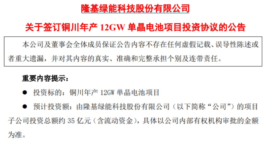隆基綠能10日披露,其4月8日與銅川市人民政府、銅川新材料產(chǎn)業(yè)園區(qū)管理委員會簽訂單晶電池項目投資合作協(xié)議,擬在陜西省銅川新材料產(chǎn)業(yè)園區(qū)投資建設(shè)年產(chǎn)12GW單晶電池項目。項目投資總額約35億元(含流動資金),預(yù)計2024年下半年開始投產(chǎn),2024年底達產(chǎn)。
