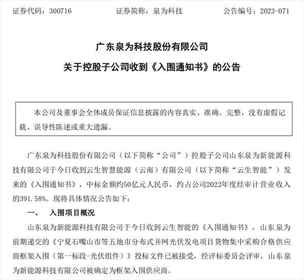 4月11日晚間,泉為科技發(fā)布公告稱,山東泉為收到云生智慧能源(云南)有限公司(簡(jiǎn)稱“云生智能”)發(fā)來的《入圍通知書》,山東泉為前期遞交的投標(biāo)文件已被接受,經(jīng)評(píng)標(biāo)委員會(huì)評(píng)審,山東泉為被確定為框架入圍供應(yīng)商。中標(biāo)金額約50億元,約占公司2022年度經(jīng)審計(jì)營(yíng)業(yè)收入的391.58%。