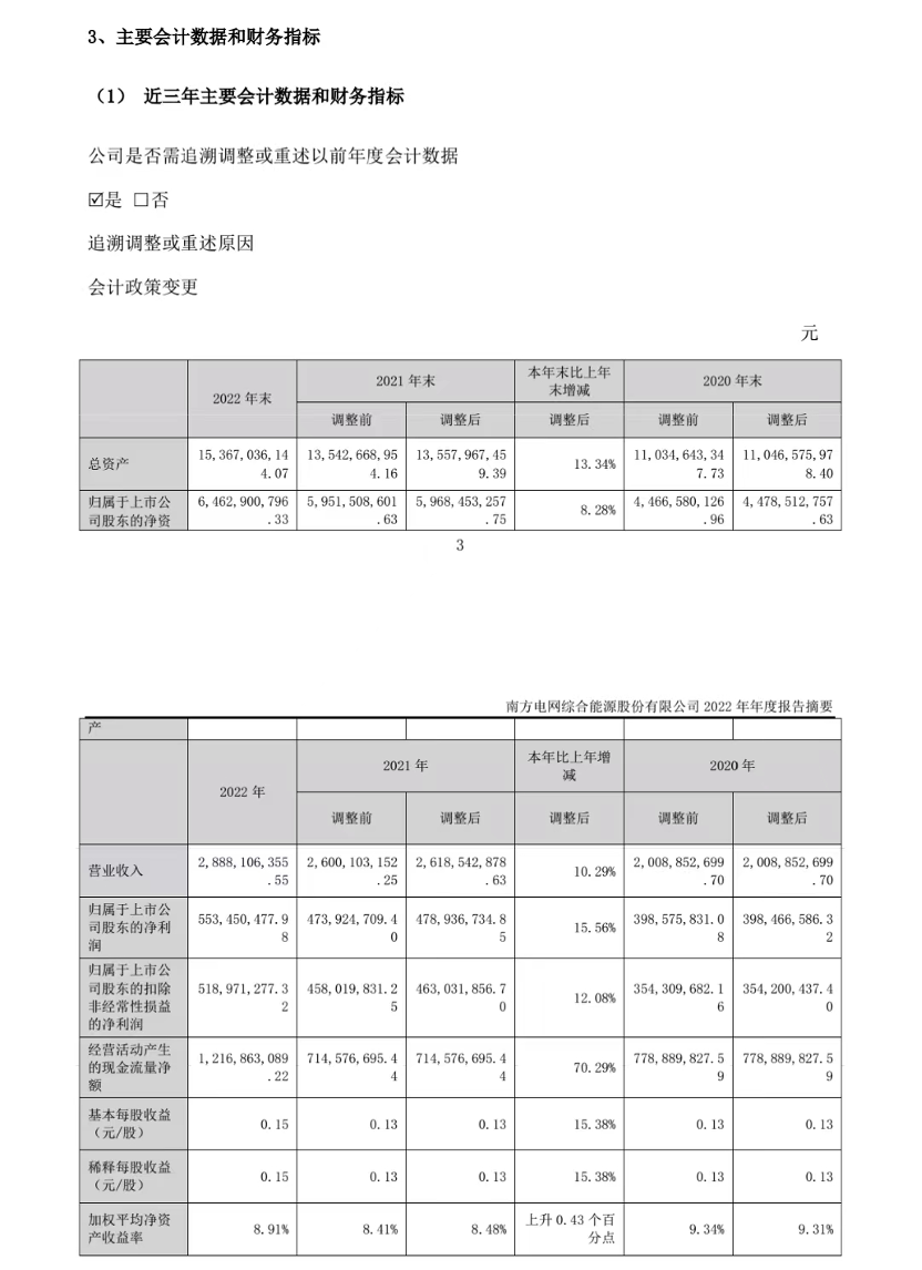 根據(jù)年報(bào),2022年,南網(wǎng)能源實(shí)現(xiàn)營(yíng)業(yè)收入約28.88億元,同比增長(zhǎng)10.29%;歸屬于上市公司股東的凈利潤(rùn)約5.53億元,同比增長(zhǎng)15.56%;歸屬于上市公司股東的扣除非經(jīng)常性損益的凈利潤(rùn)5.19億元,同比增長(zhǎng)12.08%;基本每股收益0.15元,公司擬每10股派發(fā)現(xiàn)金紅利0.147元(含稅)。