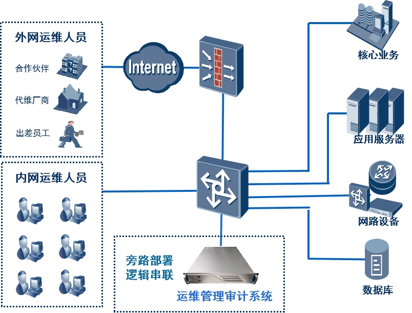 結(jié)合ITIL、ITSM、IT 內(nèi)控、SOX法案COBIT 法規(guī)、信息安全等級(jí)保護(hù)、密評(píng)合規(guī)性及IT運(yùn)維管理要求,專注于網(wǎng)絡(luò)信息安全領(lǐng)域的吉大正元,綜合多年IT運(yùn)維管理建設(shè)經(jīng)驗(yàn)和業(yè)界信息安全建設(shè)的基礎(chǔ)上,在不更改原有網(wǎng)絡(luò)拓?fù)浣Y(jié)構(gòu)、不影響服務(wù)器的業(yè)務(wù)數(shù)據(jù)流、不需要在被保護(hù)服務(wù)器和終端上安裝任何Agent的情況下,滿足用戶對(duì)企業(yè)“人機(jī)”交互、企業(yè)“應(yīng)用”交付的集中管理、集中認(rèn)證、集中控制、集中審計(jì)等一系列安全需求。