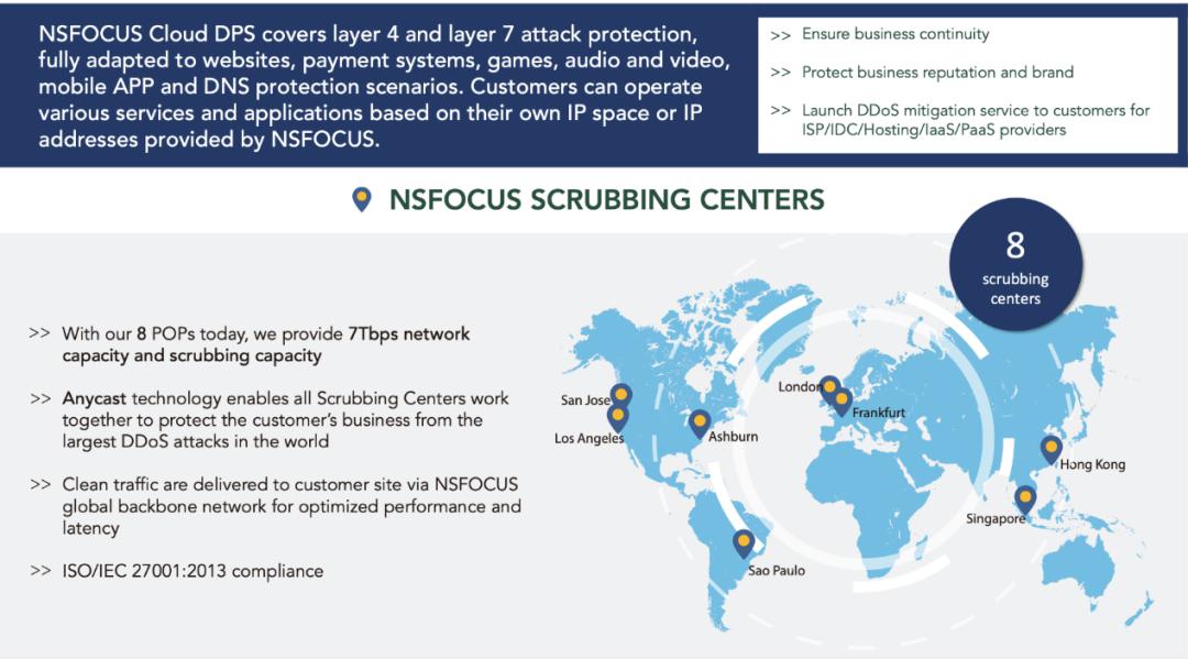 綠盟科技在全球8個數(shù)據(jù)中心搭建了云清洗平臺,通過Anycast技術(shù),綠盟科技國際云清洗服務(wù)可實現(xiàn)全球節(jié)點聯(lián)合近源清洗。2019年新增巴西圣保羅節(jié)點,提供T級云端DDoS防護(hù)能力。