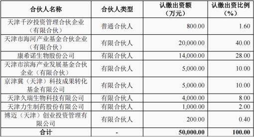 依據(jù)公告,康希諾此次參與設(shè)立的基金名稱為“元希海河(天津)生物醫(yī)藥產(chǎn)業(yè)基金合伙企業(yè)(有限合伙)”(簡(jiǎn)稱“元希海河基金”),成立于2023年4月20日,基金規(guī)模5億元,共有8名投資人(如下圖)。