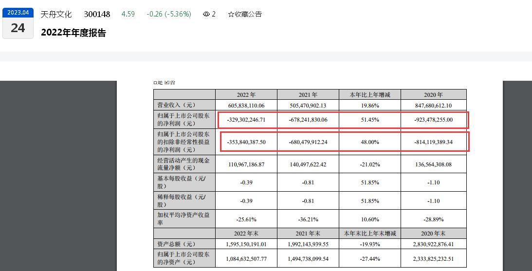 剛剛,天舟文化(300148)披露了2022年度報告,顯示,受游戲業(yè)務拖累,全年歸母凈利潤繼續(xù)虧損。從最近五年來看,天舟文化凈利潤合計虧損將近30億元,從2010年上市以來,其凈利潤合計虧損逾20億元。