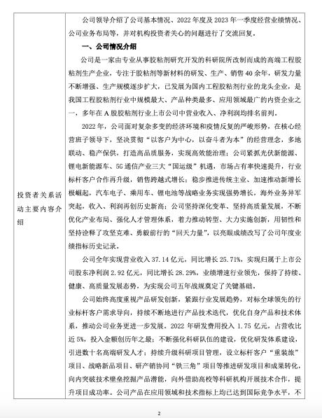 回天新材向投資者介紹了公司基本情況、2022年度及2023年一季度經(jīng)營業(yè)績情況、公司業(yè)務(wù)布局等,并對機構(gòu)投資者關(guān)心的問題進行了交流回復(fù)。