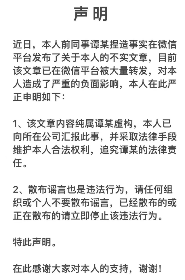同日(4月7日),陳杭在朋友圈回應(yīng)稱“文章內(nèi)容純屬譚珺虛構(gòu),本人已向所在公司匯報此事,并采取法律手段維護(hù)本人合法權(quán)利,追究譚珺的法律責(zé)任”。同時,陳杭還向傳播上述爆料消息的博主發(fā)出了律師函。