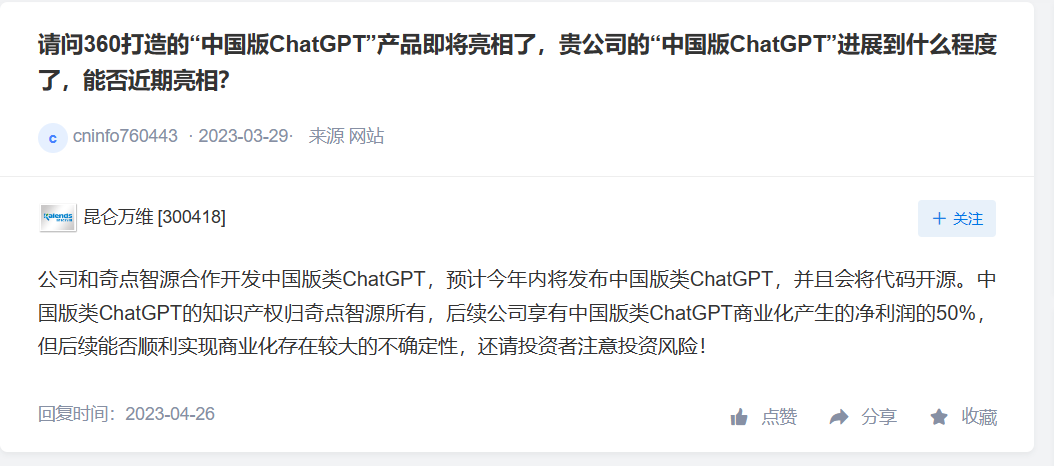 5 月 6 日消息,昆侖萬維(300418)(300418)在投資者互動平臺回復(fù)了投資者感興趣的問題。