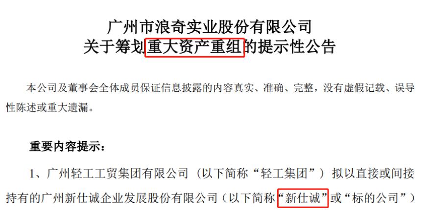 根據(jù)廣州浪奇這份重大資產(chǎn)重組公告,廣州輕工集團(tuán)擬以直接或間接持有的廣州新仕誠(chéng)企業(yè)發(fā)展股份有限公司不低于51%的股份與廣州浪奇所持有的廣州浪奇日用品有限公司(“南沙浪奇”)100%股權(quán)、韶關(guān)浪奇有限公司100%股權(quán)、遼寧浪奇實(shí)業(yè)有限公司100%股權(quán)、廣州市日用化學(xué)工業(yè)研究所有限公司60%股權(quán)等值部分進(jìn)行資產(chǎn)置換。擬置出資產(chǎn)交易價(jià)格超過(guò)擬置入資產(chǎn)交易價(jià)格的置換差額以現(xiàn)金補(bǔ)足(如有)。