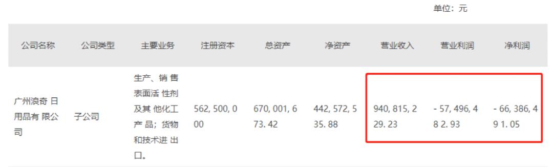 2022年年報(bào)顯示,公司日化板塊的銷量下滑16.43%,庫(kù)存增長(zhǎng)近10%,主要產(chǎn)品洗衣粉、液體洗滌劑、陰離子表面活性劑的產(chǎn)能利用率分別只有78%、60%、60%。主力公司廣州浪奇日用品有限公司(即“南沙浪奇”)去年?duì)I業(yè)收入9.41億元,凈利潤(rùn)虧損6638.6萬(wàn)元,而廣州浪奇去年凈利潤(rùn)虧損額是7161萬(wàn)元,也就是說(shuō)日化板塊的虧損占公司整體虧損在九成以上。