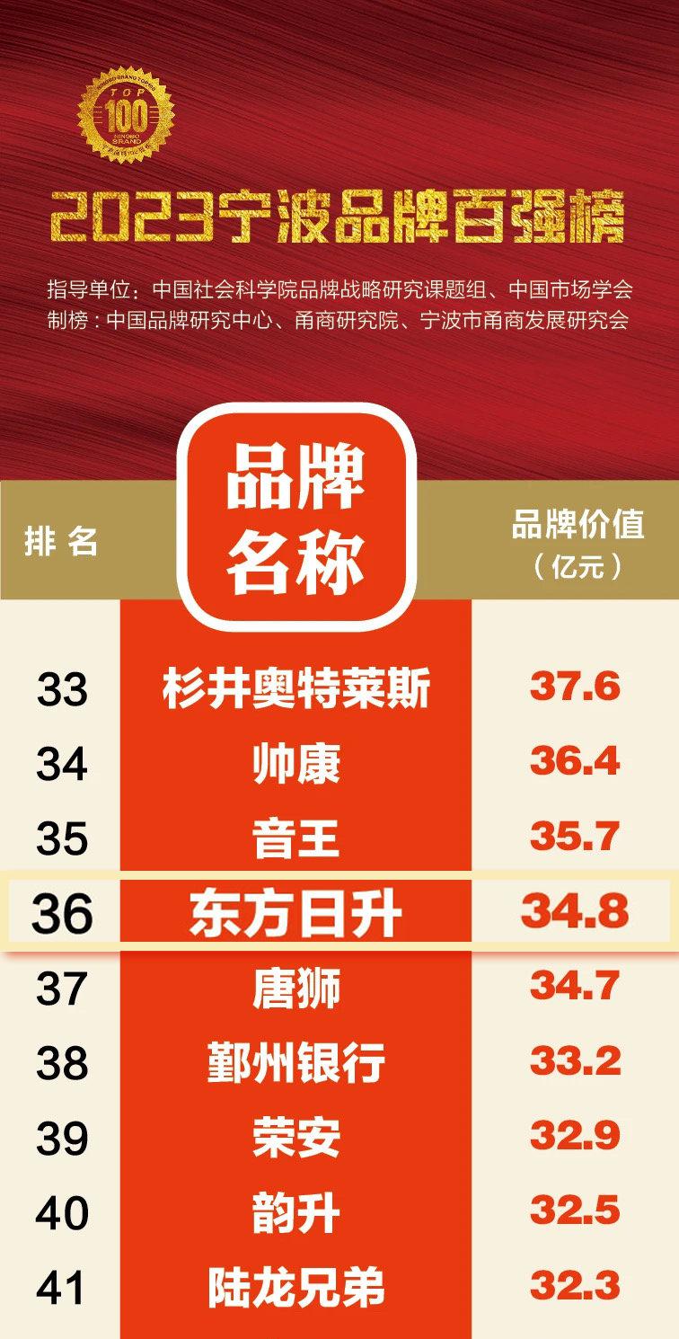 寧波品牌百強(qiáng)榜已連續(xù)發(fā)布十年,今年在總價值和上榜門檻上均有新突破。100個上榜企業(yè)總價值突破4730.5億元,上榜門檻達(dá)5億元。東方日升以34.8億元的品牌價值榮登總榜第36位。