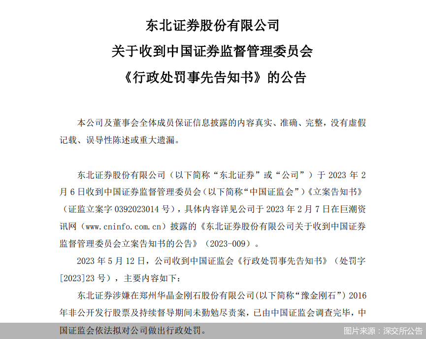 7年舊案被翻出,東北證券難逃其咎。5月14日,東北證券發(fā)布公告表示,5月12日,公司收到中國證監(jiān)會《行政處罰事先告知書》,指出東北證券涉嫌在豫金剛石2016年非公開發(fā)行股票及持續(xù)督導(dǎo)期間未勤勉盡責(zé)案,證監(jiān)會依法擬對東北證券做出行政處罰。