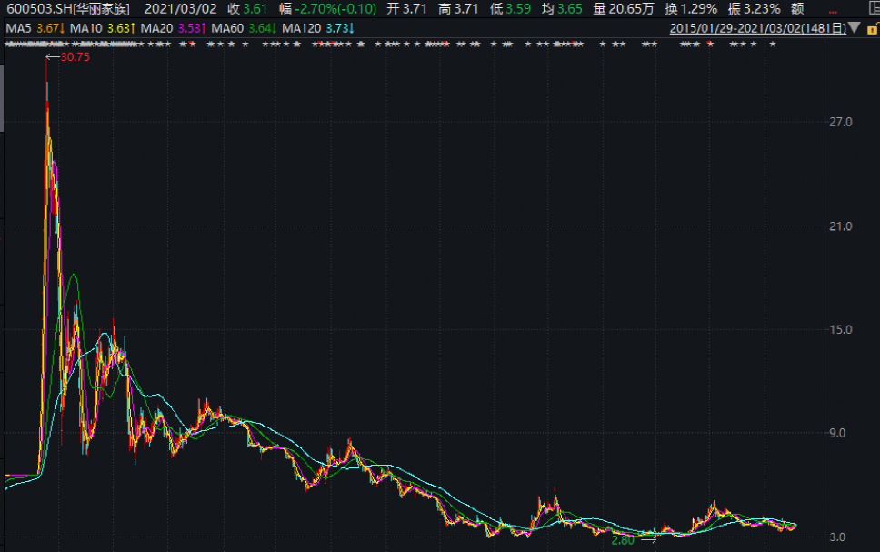華麗家族在2015年的股價最高達30.75元,隨后不斷下跌,已經(jīng)淪為2元股多年,澤熙系持股市值已跌至2億元。