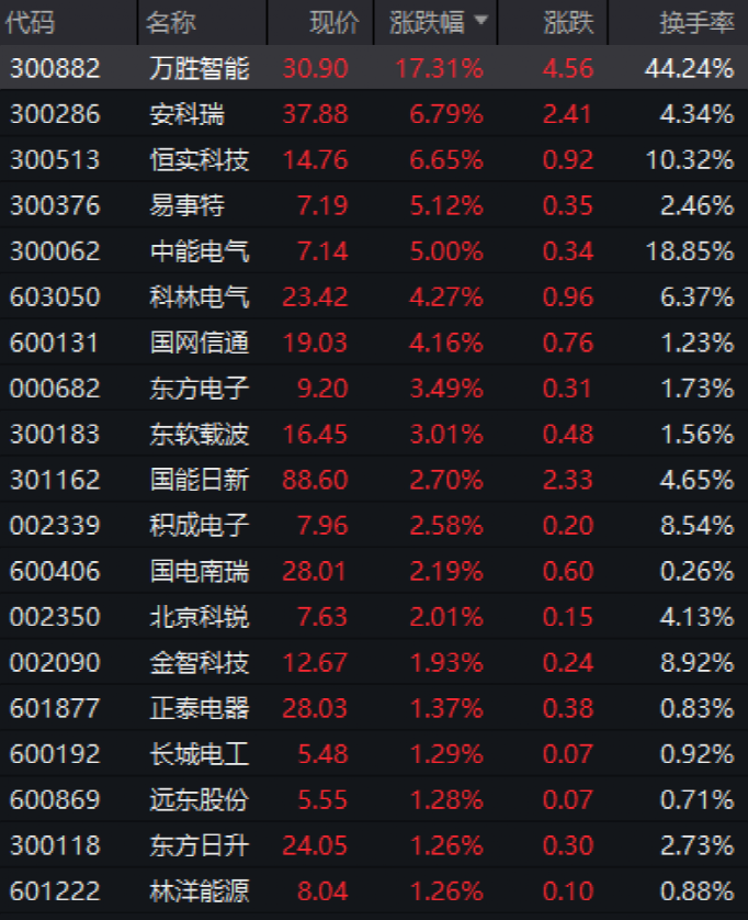 新能源板塊繼續(xù)活躍,虛擬電廠概念股持續(xù)走強,萬勝智能(300882)大漲超17%,安科瑞(300286)、恒實科技(300513)、中能電氣(300062)等均漲超5%。