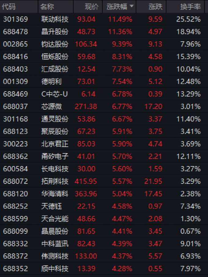 此外,芯片、半導(dǎo)體板塊震蕩反彈,存儲芯片方向領(lǐng)漲。聯(lián)動科技(301369)、晶升股份漲超11%,鈞達股份(002865)、匯成股份等均漲超7%。