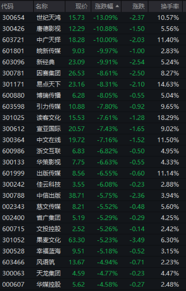 傳媒板塊快速跳水,世紀天鴻(300654)跌超13%,皖新傳媒(601801)、中廣天擇(603721)等跌停,新經(jīng)典(603096)、易點天下(301171)、引力傳媒(603598)均大跌超6%。