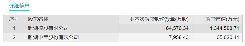 解禁市值居第二的湘財(cái)股份,解禁股東為新湖控股有限公司、新湖中寶(600208)股份有限公司,其中新湖控股有限公司為湘財(cái)股份第一大股東。下周解禁的股份來自湘財(cái)股份2020年6月實(shí)施的定向增發(fā)股份,彼時(shí)湘財(cái)股份的定增發(fā)行價(jià)為4.79元/股。