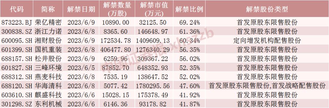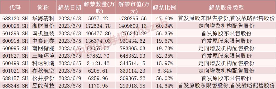 具體來看,數(shù)據(jù)顯示,華海清科6月8日將解禁5077.42萬股,為首發(fā)原股東限售股份和首發(fā)戰(zhàn)略配售股份。湘財(cái)股份6月9日將解禁17.25億股,均為定向增發(fā)機(jī)構(gòu)配售股份。國機(jī)重裝6月8日將解禁40.65億股,均為首發(fā)原股東限售股份。
