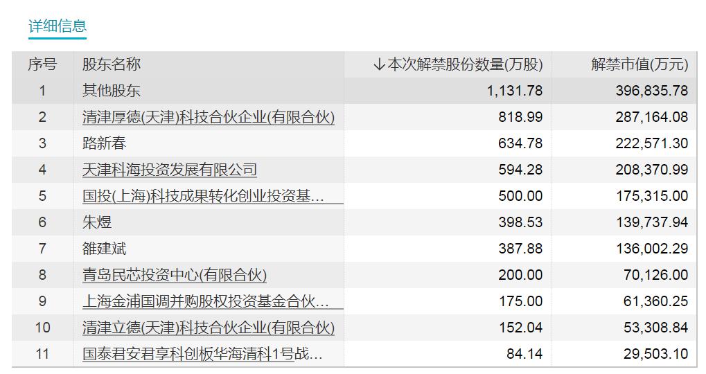 具體來看,在下周面臨解禁的77只股票中,解禁市值最大的華海清科解禁股東分別為清津厚德(天津)科技合伙企業(yè)(有限合伙)、路新春、天津科海投資發(fā)展有限公司等多個(gè)股東,其中清津厚德(天津)科技合伙企業(yè)(有限合伙)為華海清科第二大股東。