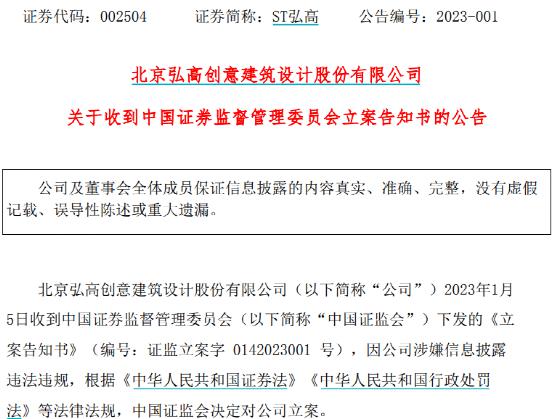 今年1月5日,公司公告稱,收到中國(guó)證監(jiān)會(huì)下發(fā)的《立案告知書》(編號(hào):證監(jiān)立案字 0142023001 號(hào)),因公司涉嫌信息披露違法違規(guī),中國(guó)證監(jiān)會(huì)決定對(duì)公司立案。