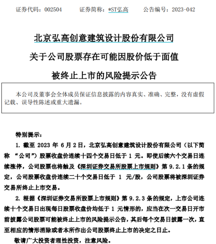 6月4日晚間,*ST弘高(002504)發(fā)布公告稱,截至6月2日收盤,公司收盤價(jià)已連續(xù)14個(gè)交易日低于1 元,即使后續(xù)6個(gè)交易日連續(xù)漲停,公司股價(jià)也無法回到1元及以上。