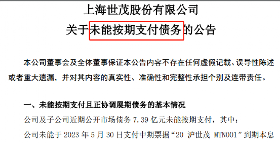 6月2日晚公司公告,公司及子公司近期公開(kāi)市場(chǎng)債務(wù)7.39億元未能按期支付,其中:公司未能于2023年5月30日支付中期票據(jù)“20滬世茂MTN001”到期本息2540萬(wàn)元、“21滬世茂MTN001”到期利息833萬(wàn)元、“21滬世茂MTN002”到期利息586萬(wàn)元;子公司未能于2023年4月10日支付資產(chǎn)支持專項(xiàng)計(jì)劃“希爾頓01”的資產(chǎn)支持證券退出款7億元。