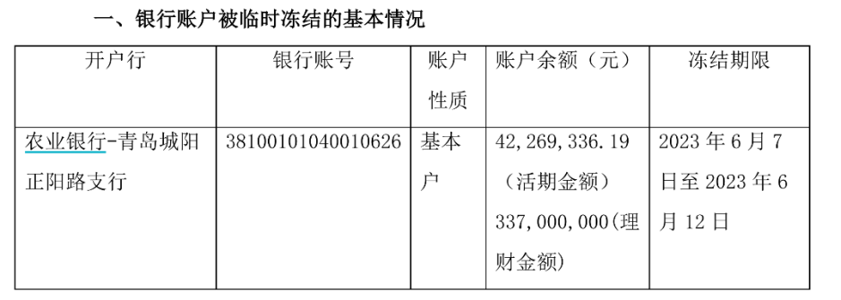 海利爾公告披露,該凍結(jié)賬戶開戶行為“ 農(nóng)業(yè)銀行-青島城陽正陽路支行”,賬戶余額包括活期金額4226.93萬元和理財(cái)金額3.37億元,凍結(jié)期限為2023年6月7日至2023年6月12日。