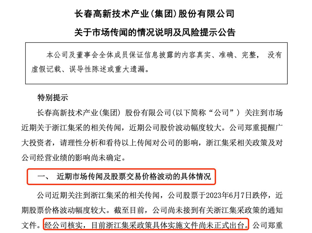 6月11日晚,長春高新發(fā)布公告,對相關傳聞進行澄清。長春高新表示,截至目前,公司尚未接到有關浙江集采政策的通知文件。經公司核實,目前浙江集采政策具體實施文件尚未正式出臺。