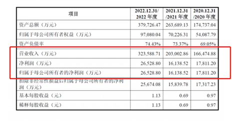 明陽電氣《招股說明書》顯示,明陽電氣2020年、2021年、2022年營收分別為16.65億元、20.3億元、32.36億元;凈利分別為1.78億元、1.61億元、2.65億元;扣非后凈利分別為1.73億元、1.58億元、2.57億元。