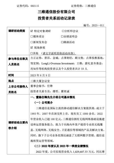 三維通信向投資者介紹了公司基本情況。三維通信是國際主流的移動(dòng)通信解決方案提供商,成立于1993年,2007年在深交所上市,現(xiàn)有員工1000余名,2022年?duì)I業(yè)收入已超100億元。三維通信擁有無線網(wǎng)絡(luò)基礎(chǔ)設(shè)施建設(shè)和運(yùn)營服務(wù)能力,致力于向海內(nèi)外客戶提供專業(yè)的無線覆蓋、無線網(wǎng)絡(luò)、無線安全、衛(wèi)星通信等領(lǐng)域的產(chǎn)品及解決方案。同時(shí),旗下子公司業(yè)務(wù)范圍還涵蓋了互聯(lián)網(wǎng)數(shù)字營銷、通信設(shè)施租賃運(yùn)營等領(lǐng)域。