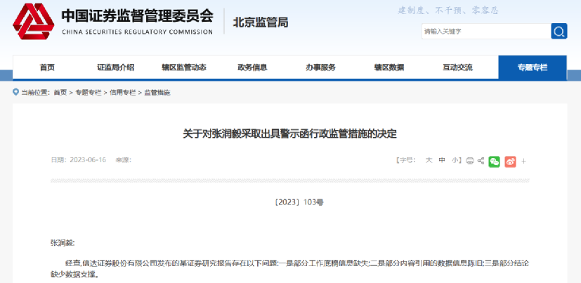 北京證監(jiān)局指出,信達證券發(fā)布的某證券研究報告存在以下問題:一是部分工作底稿信息缺失;二是部分內(nèi)容引用的數(shù)據(jù)信息陳舊;三是部分結(jié)論缺少數(shù)據(jù)支撐。張潤毅作為該研究報告署名證券分析師,對研究報告內(nèi)容負有直接責任。