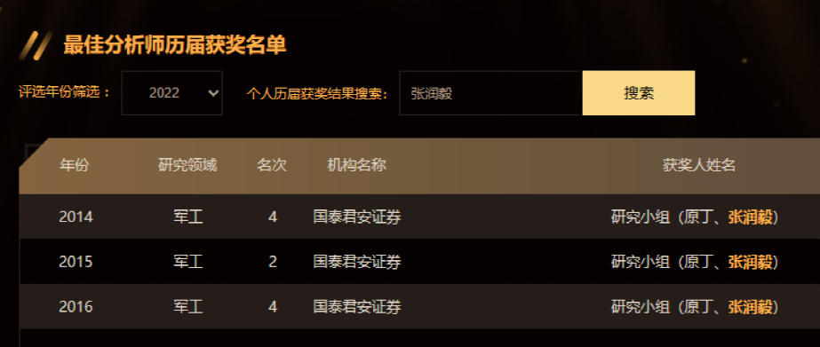 據(jù)了解,張潤毅的研究方向為國防軍工,2014-2016年在國泰君安工作期間,曾多次登榜新財富最佳分析師評選,曾為國泰君安軍工行業(yè)首席分析師。