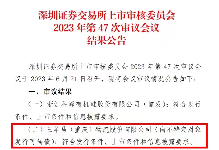 6月21日,深交所上市委員會(huì)2023年第47次審議會(huì)議結(jié)果顯示,三羊馬(001317)(001317)向不特定對(duì)象發(fā)行可轉(zhuǎn)債的申請(qǐng)獲通過。