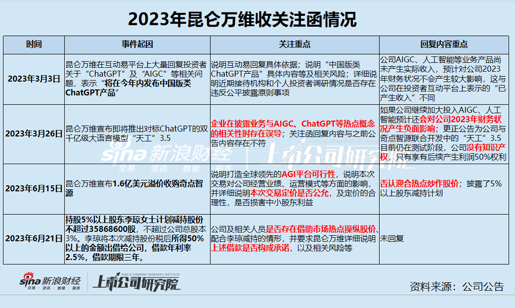 需要注意的是,今年3月,昆侖萬維就連續(xù)兩次收到了深交所的關(guān)注函,起因是昆侖萬維在投資者互動(dòng)平臺(tái)上回復(fù)ChatGPT、AIGC相關(guān)問題,后續(xù)推出大模型“天工”等,但公告具體披露的內(nèi)容卻與投資者互動(dòng)平臺(tái)表述以及回復(fù)函中的相關(guān)內(nèi)容存在不符。