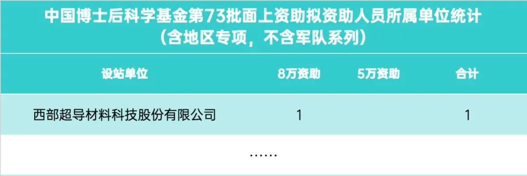 根據(jù)《關(guān)于對(duì)中國(guó)博士后科學(xué)基金第73批面上資助擬資助人員名單進(jìn)行公示的通知》(中博基字〔2023〕8號(hào)),經(jīng)評(píng)選并認(rèn)定,共有4004位擬資助人員入選(軍隊(duì)系統(tǒng)擬資助人員未公開名單),其中包含西部超導(dǎo)材料科技股份有限公司博士后科研工作站1人。