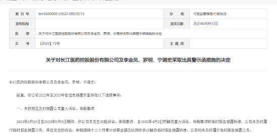 近日,山東證監(jiān)局披露了《關(guān)于對長江醫(yī)藥控股股份有限公司及李金鳳、羅明、寧潞宏采取出具警示函措施的決定》的公告。