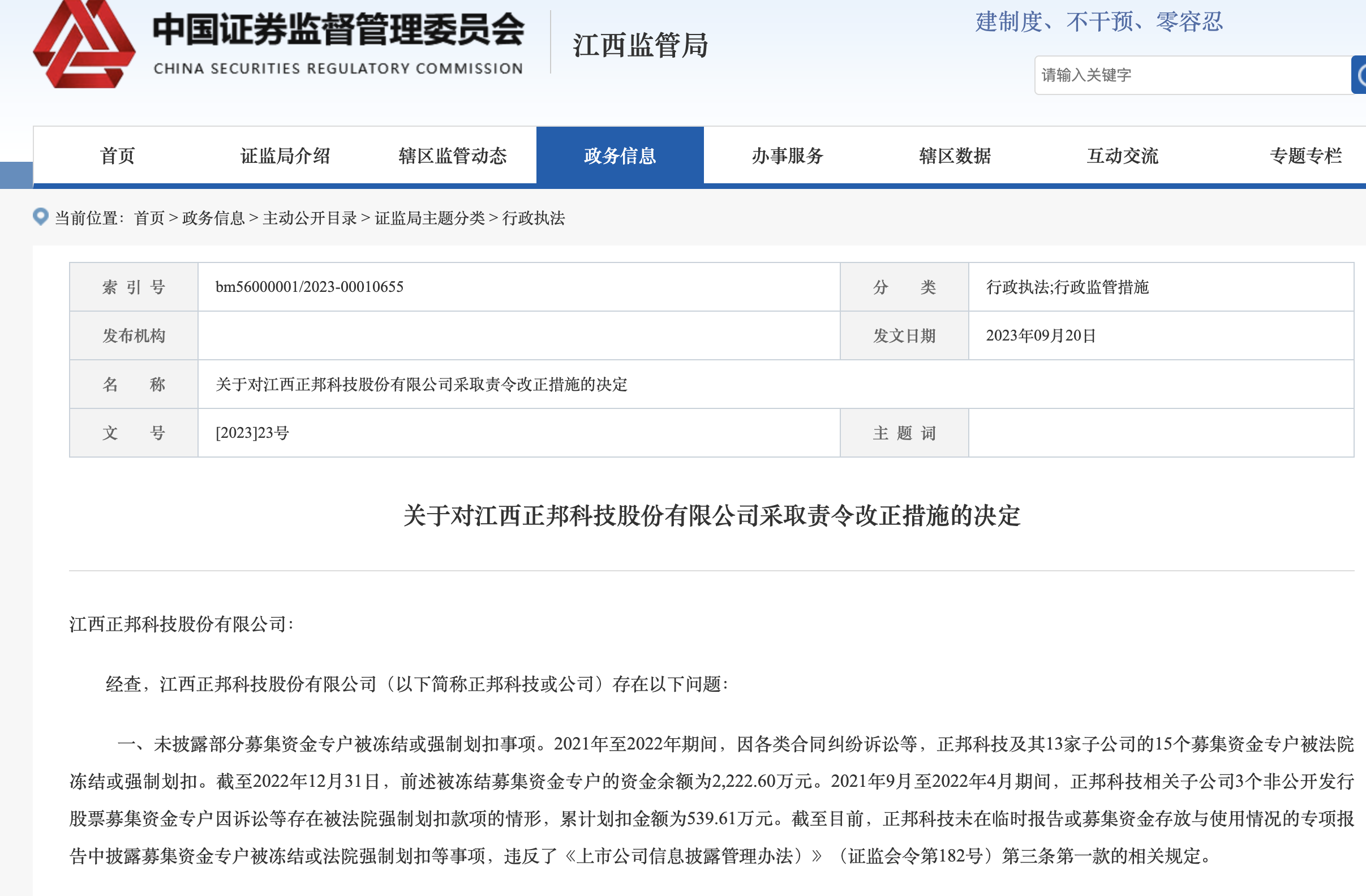 正邦科技的主要問題在于未能及時披露有關(guān)事項。相關(guān)決定書中提到,2021年至2022年期間,因各類合同糾紛訴訟等,正邦科技及其13家子公司的15個募集資金專戶被法院凍結(jié)或強制劃扣。截至2022年12月31日,前述被凍結(jié)募集資金專戶的資金余額為2222.60萬元。