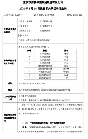 投資者關(guān)心,2024年原料收購成本降低,全年毛利率展望?涪陵榨菜回復(fù):公司每年青菜頭收購后將在當(dāng)年5、6月份逐步投入使用,原料成本將在每年下半年逐步體現(xiàn),上半年營業(yè)成本取決于上年度青菜頭收購價格,青菜頭收購價去年同期約為1100元/噸,全年整體來看原料收購價格降低對毛利率影響不大。