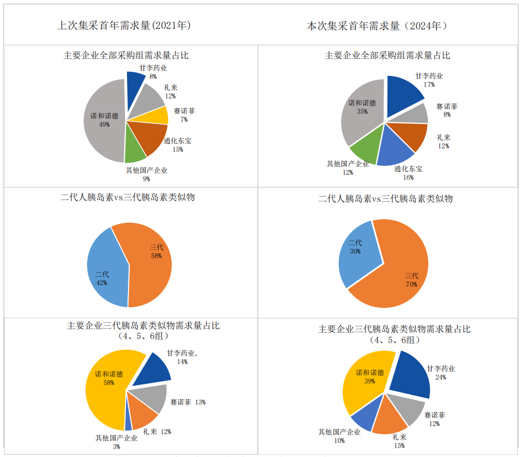 而且,集采還在繼續(xù)引發(fā)市場需求變動。根據(jù)甘李藥業(yè)年報提供的2024年胰島素接續(xù)集采首年采購需求量,三代胰島素采購需求量為1.68億支,占比整體需求量的70%,較上次集采的首年采購需求量增長36%。二代胰島素本次首年采購需求量占比30%,較上次占比有所減少。