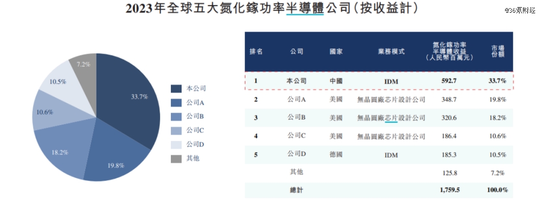2021—2023年,英諾賽科的營業(yè)收入分別為0.68億元、1.36億元和5.93億元,根據(jù)英諾賽科招股說明書披露,按營收口徑,英諾賽科2023年在氮化鎵功率半導(dǎo)體的市場(chǎng)份額約為33.7%,前五大市場(chǎng)份額合計(jì)92.8%。按氮化鎵分立器件數(shù)量折算,英諾賽科2023年以來累計(jì)出貨量超5億顆,市占率42.4%。