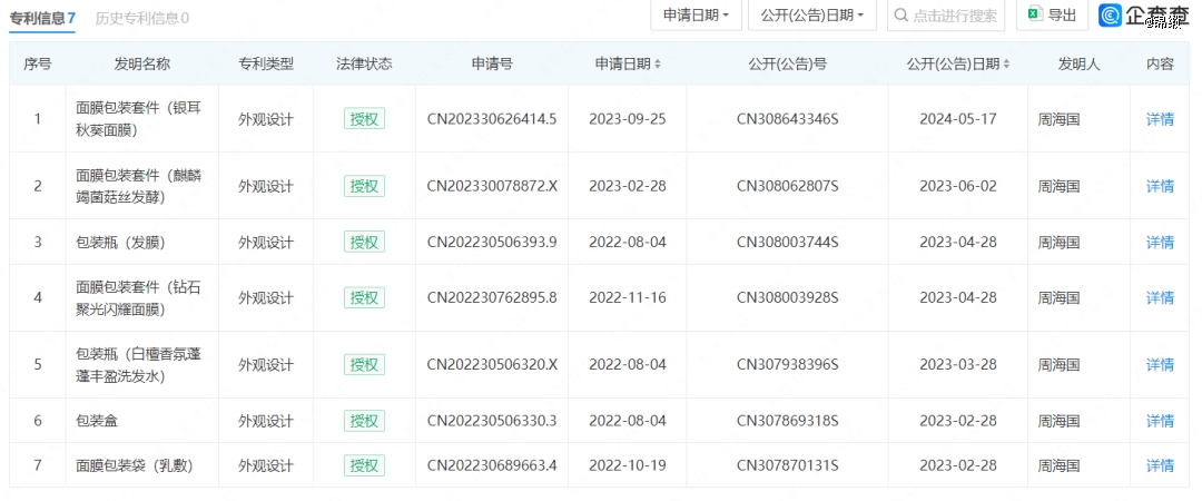而實(shí)際上,F(xiàn)B雖然營銷用語看起來高端且富有科技感,可一直也并沒有顯示出太多的科技證據(jù)。拿簡單的專利技術(shù)一項(xiàng)來說,根據(jù)企查查顯示,范美麗(海南)化妝品有限公司名下有7項(xiàng)專利信息,無一例外全部是外觀設(shè)計(jì)專利。