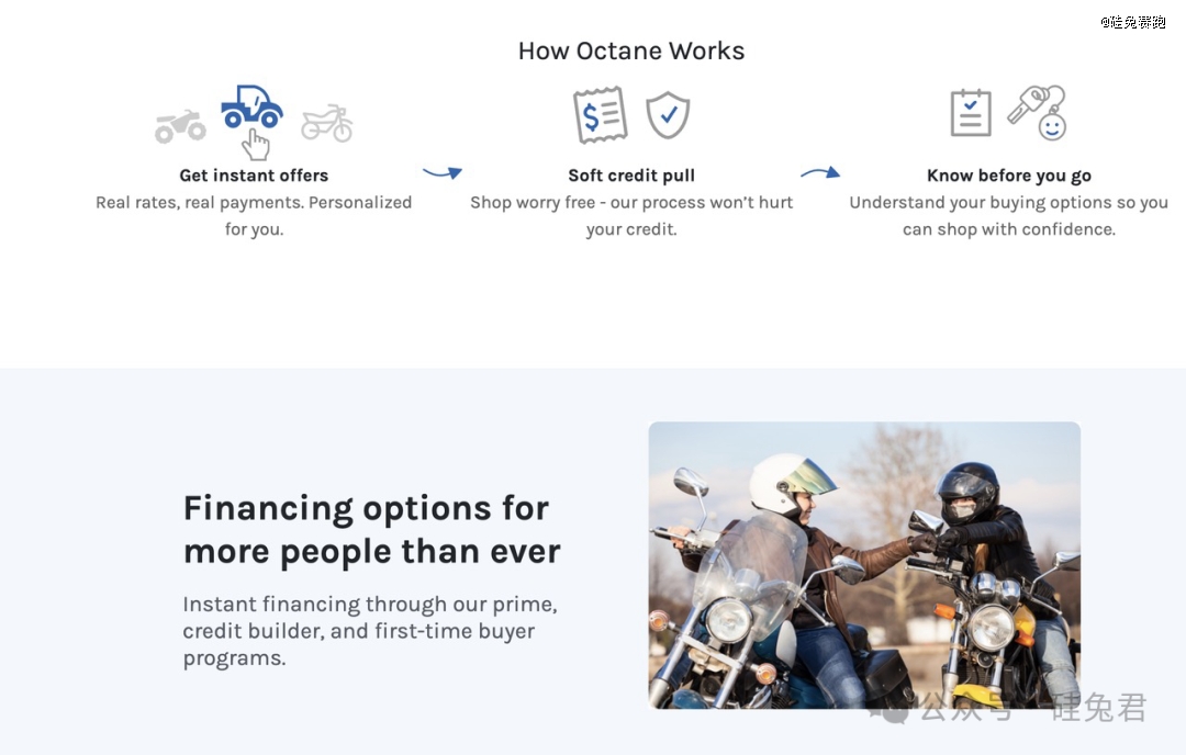 Octane成立于2014年,主要為割草機(jī)、車等產(chǎn)品提供借貸服務(wù)。簡單地說,它希望幫助想要購買摩托車、雪地摩托、水上摩托艇和全地形車等物品的用戶直接獲得所需的融資。