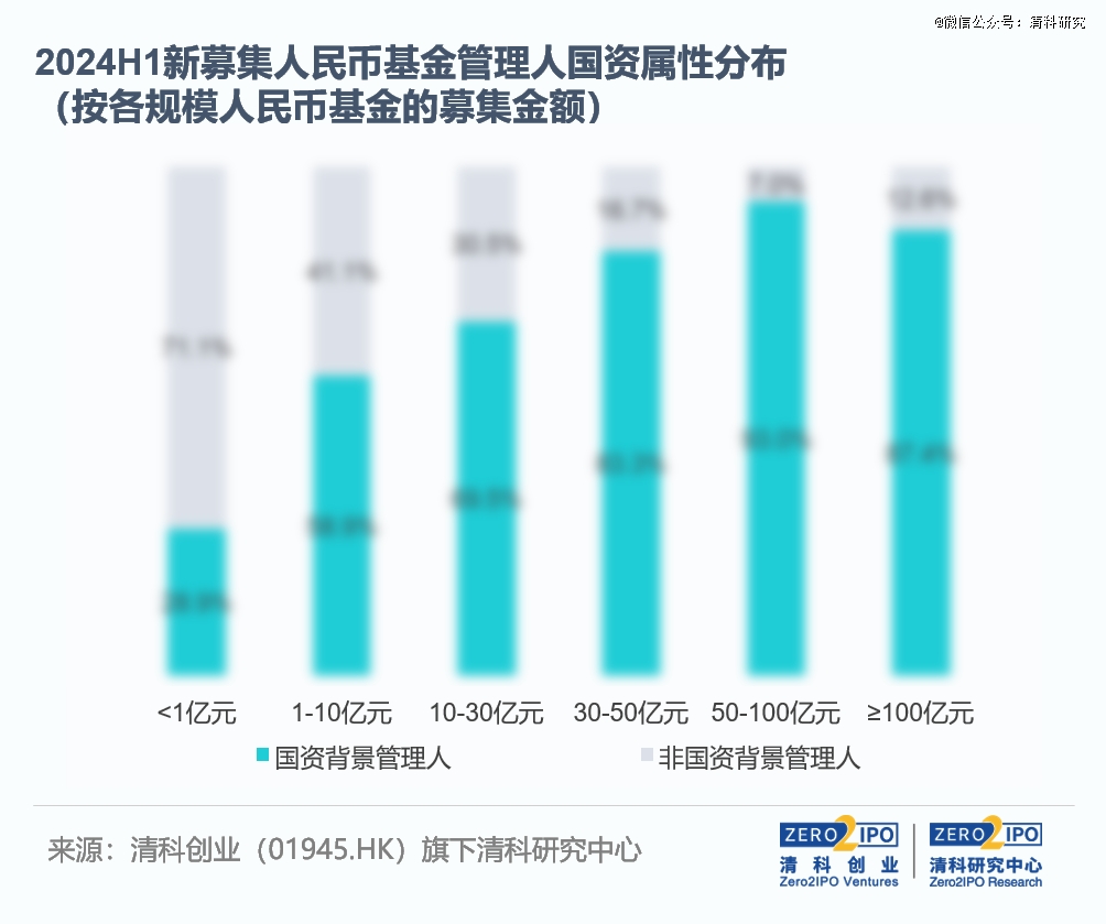 國資背景管理人的募資規(guī)模仍保持優(yōu)勢。除金額不足1億元人民幣的小規(guī)模基金外,其余各規(guī)模區(qū)間的新募集人民幣基金中,國資背景管理人所管基金的新募集金額占比均超過五成。上半年新募集金額在30億元及以上的人民幣基金中,這一比例均在80%以上。