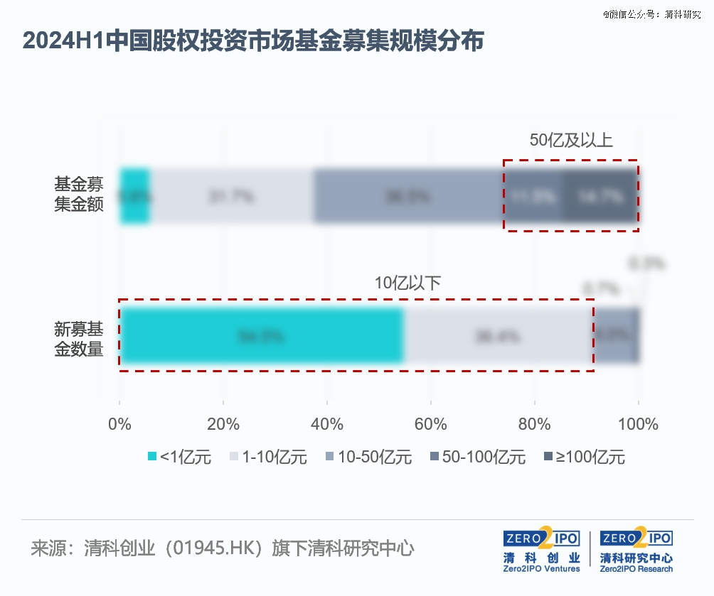 2024年上半年中國股權(quán)投資市場新募集基金仍以小規(guī)?;馂橹鳎履家?guī)模不足1億元人民幣的基金數(shù)量占比保持在五成以上。而其總募資規(guī)模不足400億元人民幣,占比僅為5.6%,相較2023年同期下降了3.8pct。大額基金的設(shè)立與募集相對穩(wěn)定,上半年共有19只基金的新募集規(guī)模在50億元及以上,合計募資規(guī)模為1,634.03億元人民幣,占比超過全市場募資總規(guī)模的1/4。