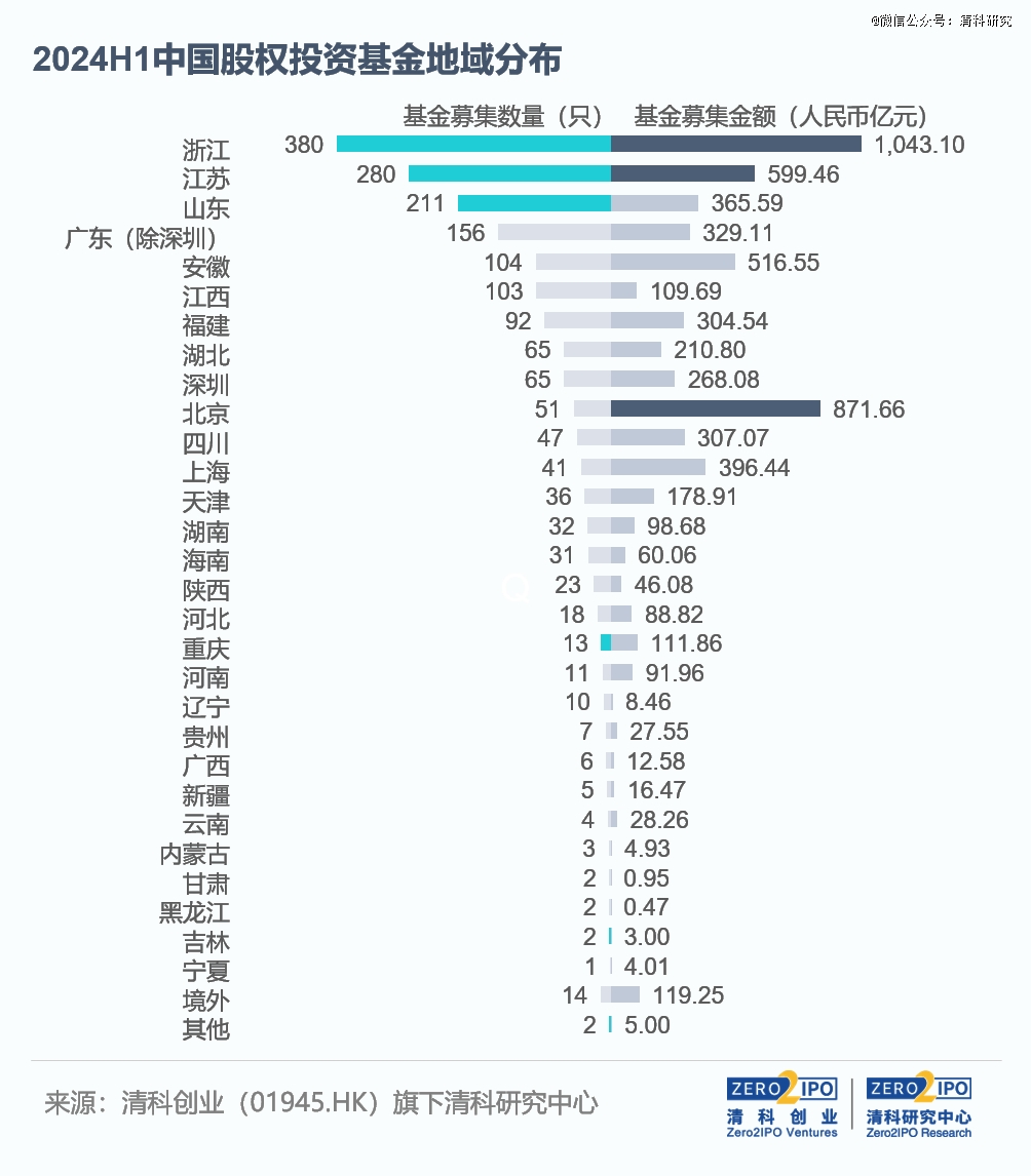 2024年上半年,全國各地的新募基金數(shù)量和募資規(guī)模普遍出現(xiàn)不同程度的下降。但總體來看,浙江、江蘇、山東、廣東等地募資情況仍相對*。其中,浙江上半年新募基金數(shù)量*全國,共380只基金完成新一輪募集,但同比降幅達49.3%;募資規(guī)模為1,043.10億元人民幣,同比雖下滑12.5%,卻是全國*一個募資規(guī)模超過千億的地區(qū)。江蘇、山東兩地的新募集基金數(shù)量*于其他地區(qū),基金數(shù)量均超過200只,但同比降幅均在40%以上。2024年上半年,北京共計51只基金完成新一輪募集,同比小幅提高4.1%。在多只國資背景管理人發(fā)起設(shè)立的大額基金影響下,北京募資規(guī)模達到871.66億元人民幣,位居全國第二位。
