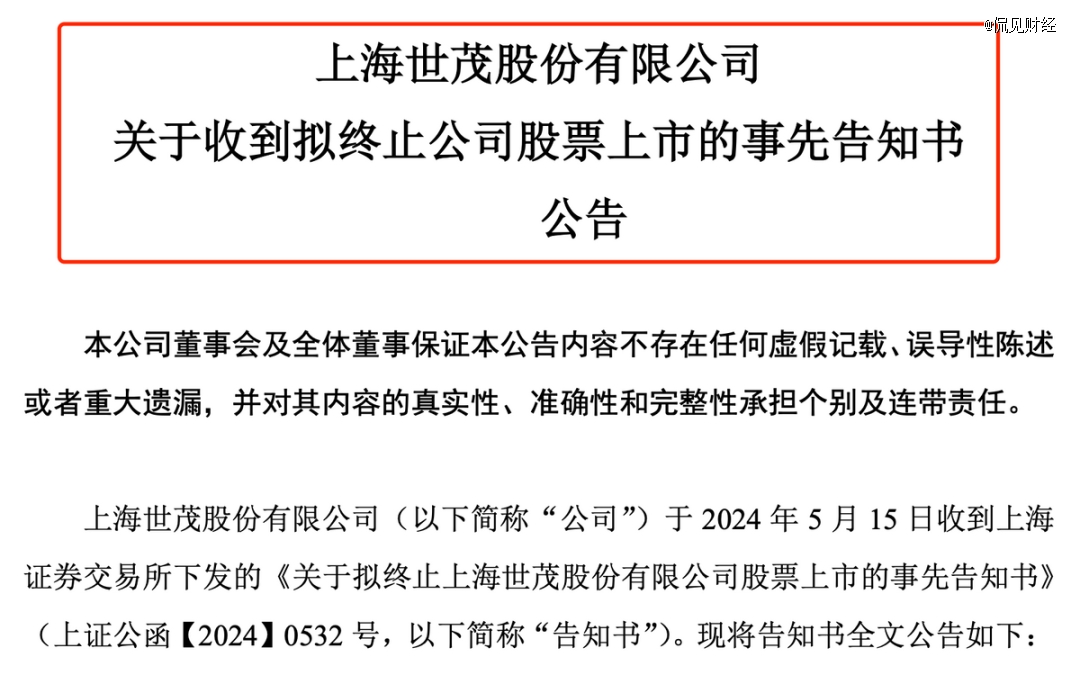 近日,世茂股份公告稱,公司收到上交所下發(fā)的《關(guān)于擬終止上海世茂股份有限公司股票上市的事先告知書》。