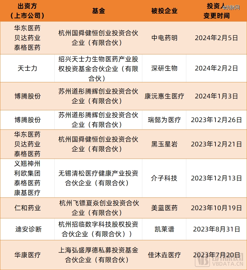 再如,天士力以3.9億元認購39%份額的“紹興天士力生物醫(yī)藥股權(quán)投資合伙企業(yè)(有限合伙)”于2024年2月投資了深研生物。博騰股份參與的“蘇州道彤騰輝創(chuàng)業(yè)投資合伙企業(yè)(有限合伙)”分別于2024年1月、2023年12月投資了康沅惠生醫(yī)療、瑞懿為醫(yī)療。“醫(yī)藥一哥”恒瑞醫(yī)藥發(fā)起設(shè)立的“上海盛迪生物醫(yī)藥私募投資基金合伙企業(yè)(有限合伙)”于2023年12月投資了洛啟生物……