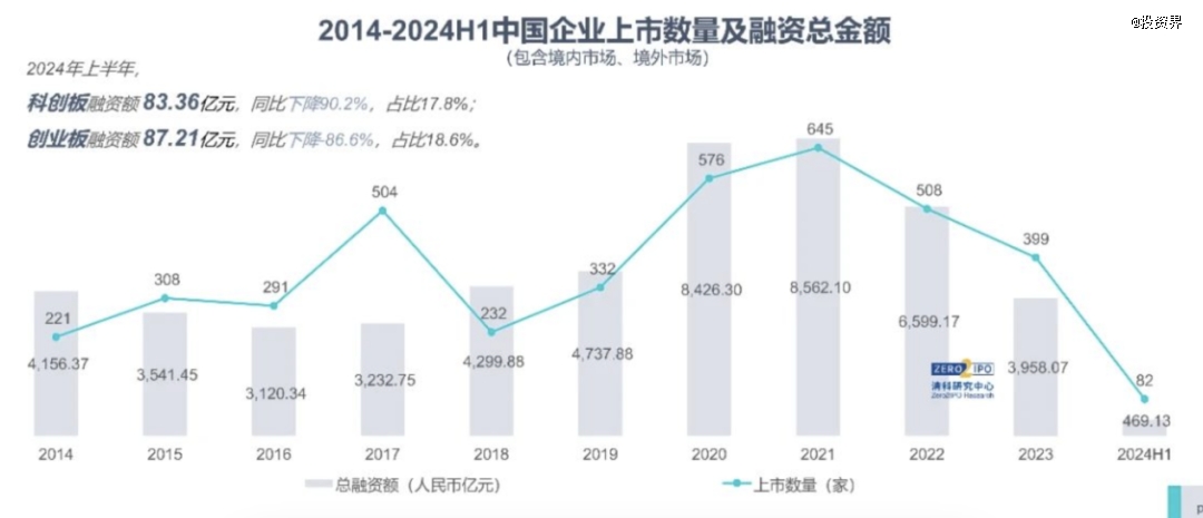 其中,VC/PE較為依賴的退出路徑——IPO漸漸變得遙遠(yuǎn)。2024年上半年僅有82家中企上市,同比下降62.4%,境外和A股被投企業(yè)IPO案例數(shù)同比分別下降20.1%、74.1%。