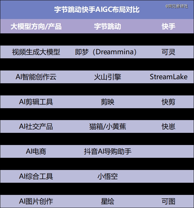 通用大模型方面,快手有快意,字節(jié)有豆包;AI圖片創(chuàng)作快手有可圖,字節(jié)有星繪;視頻生成大模型,快手有可靈,字節(jié)用即夢相對,此外在AI音樂、剪輯工具、社交產(chǎn)品、*制作等多個領(lǐng)域,快手和字節(jié)都有相應(yīng)的AIGC產(chǎn)品形成競對。